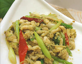 然后放入炒好的豆丹,加入胡椒粉、少量的盐轻轻拌匀出锅。