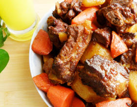 先加入胡萝卜炖5分钟再放入土豆(胡萝卜比土豆熟的慢些)和食盐,翻炒均匀继续炖至胡萝卜 土豆熟,转大火收浓汁即可。