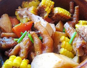 鸡脚洗净中间斩开,山药去皮切块后泡水内,玉米胡萝卜也切块。
