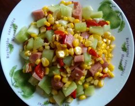 锅热后放油,先放入玉米炒一会、再加入火腿肠、黄瓜煸炒