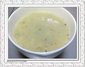 4、玉米粒放入锅里加入适量水煮熟。倒入搅拌成泥状的土豆水,煮开,再加入适量牛奶、盐,调味即可出锅。我还加入了一点香草增加香味。