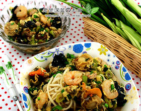 - 7. 再将虾仁、扇贝肉、蛤肉、木耳、泡发香茹一起倒入锅中大火炒