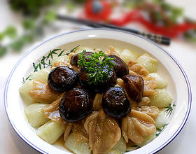 - 7. 热油锅,把蒜,姜和八角爆香,放入冬菇和鸭掌朝片刻。