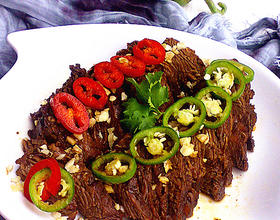 - 6. 吃时把牛肉切片,淋上另用陈醋、海鲜酱油、麻油、辣椒油、香菜、蒜粒、辣椒片拌成的酱汁,即可