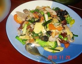 准备好所有食材:笋、藕、红菇、木耳、草菇、西兰花、西兰花、青蒜、青椒、白果。