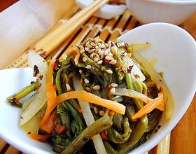 将蕨菜洗净,用沸水焯熟,再放入凉水中,冷却后捞出挤去水分。