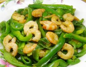 待青椒转色,放下虾仁,加些料酒煸炒.