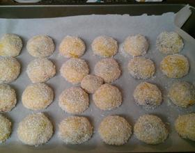 - 10. 包好之后的团子到椰丝里面滚一圈~放到盘上就不沾底了哦~