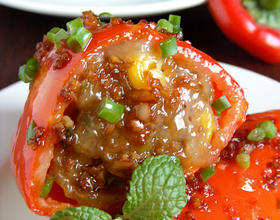 诗心片语:1:肉稍微腌制一下,会更入味。2:甜椒装入肉以后,要用淀粉封口,这样能更好的封锁住汤汁。3:甜椒表面裹上一层糯米粉,能更好的吸收淋在上面的蒜茸汁,吃起来口感更香更软糯。4:汁不要浇太多。
