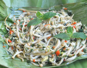 - 4. 在作料中拌入主菜,如金针菇,白豆腐和猪里脊,将芭蕉叶平铺,放上金针菇。