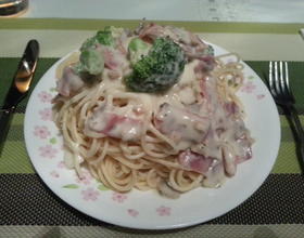 奶油加热后,也可以将食材和面条放入锅中一起搅拌。就是样子难看了点。自己吃么也无所谓啦~~嘻嘻