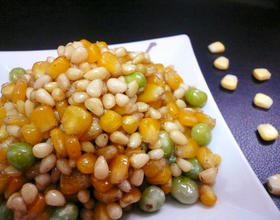 热锅凉油,先倒入松子炒一下,再倒入玉米、青豆翻炒。