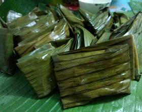 - 7. 糯米团包上馅料,抹上少许花生油,用蕉叶的背面包上,轻轻压扁