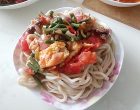 - 13. 依次放番茄、豇豆翻炒,差不多时放青红椒继续翻炒会,因为要拌拉面吃,所以加点水。