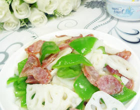 - 1. 材料:莲藕、灯椒、腊肠(已切片)