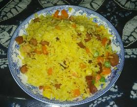 炒锅放入适量的油.再把香肠、火腿肠、菜丁放入炒熟.盛出待用.