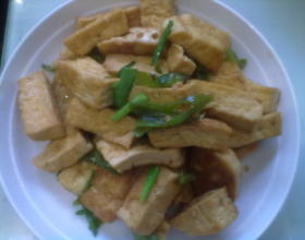 豆腐用电饼档煎至金黄,葱和青椒切段