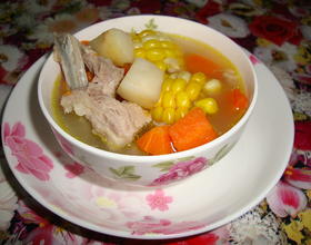 红萝卜去皮切成小方块,马蹄一个切成四半,玉米砍成小段。姜切成薄片。