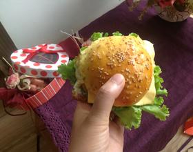 放上生菜、猪排和所有内馅,挤上沙拉酱和番茄酱