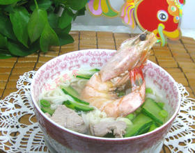 所需食材:大虾、挂面、黄瓜、葱、肉。