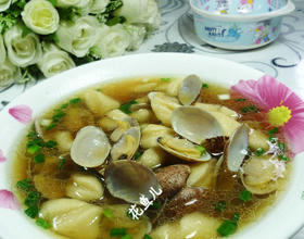 - 12. 然后,合入过凉好的面疙瘩煮开至花蛤开口。