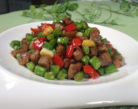 放油下蒜、四季豆炒熟,再放黑椒粒炒香,调味后倒进猪舌混炒均匀就好