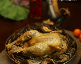主料:土鸡1只(我的这只差不多880克)、盐适量、猪油适量、新鲜荷叶1张、草绳