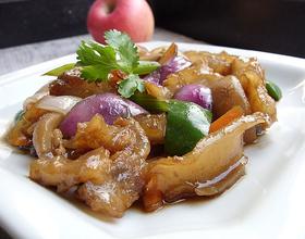 - 7. 炒好的牛筋装入碗内备用。