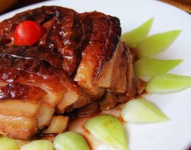 - 13. 扣肉取出滗出原汤,把肉扣在盘内。