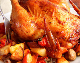 - 14. 烤盘铺好锡纸,把剩余的蔬菜块铺在烤盘里,腌好的三黄鸡放在上面。