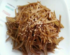 牛蒡从水中捞出放入锅中,翻炒一分钟,加酱油、香油、胡椒粉、牛肉粉和150ml清水。