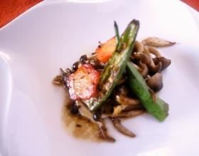 放入本占菇文火煎至出了香味后,放入秋葵和红箩卜,盖上锅盖煎熟。