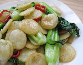 青菜翻炒几下烹入料酒随之倒入豆饼、调味、就可以了。