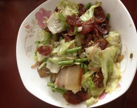 - 4. 锅里放少点油,腊肉是会出油的,把腊肉的油逼出来,肉就变成透明的了,这是可以放蔬菜下去爆炒了