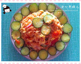 待西红柿炒出汁儿放入圆白菜,放盐翻炒两下之后放入饼丝