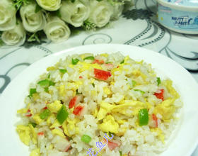 - 8. 接着,利用炒鸡蛋的油,下入切好的青椒和米饭翻炒翻炒。