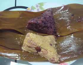 准备原料,黑米和糯米、红豆混一起,泡一晚上,粽叶洗净后煮半小时后折好
