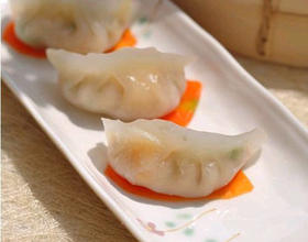 水晶虾饺包好后,底部一定要做防粘处理,垫上胡萝卜片是个很好的方法,颜色也比较好看,也可以在笼屉上刷油防粘,蒸制的时候要等蒸锅内的水完全大沸,上足气后再上屉,全程大火蒸6-7分钟即可,关火就可以立即取食。最好当天吃完,否则到了第二天就会变干。