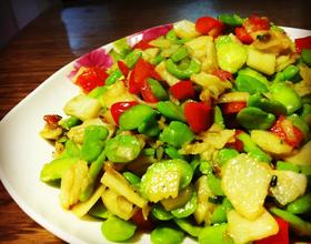 - 12. 先倒入蚕豆米翻炒两分钟,再倒入马蹄和甜椒丁,大火,快速翻炒一分钟。加入盐,蚝油,临出锅前淋少许白醋