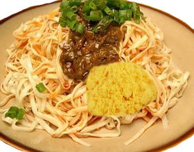 凉面加葱花、肉酱、蛋黄粉、盐拌好即可。
