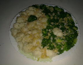 锅里加水烧开,加入一小勺油,放入花菜焯水,熟后立即用凉水冲冷,漓干水分。