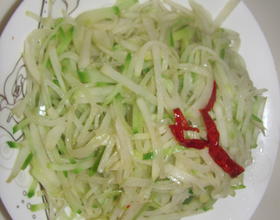 翻炒片刻,萝卜丝变软,加入盐.鸡精调味。