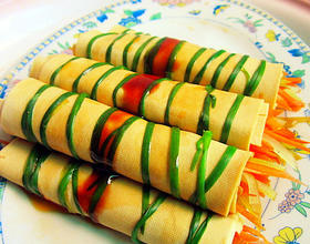 豆腐皮加适量的盐入味。取豆腐皮平铺,码上莴笋丝,胡萝卜丝。