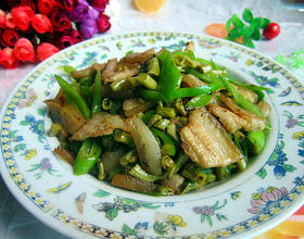 带皮五花肉去毛冼净切片,辣椒切丝,