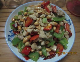 - 5. 锅里适量油、烧至7成熟,下葱、姜、蒜、花椒、干红椒翻炒至出香味,倒入青红椒翻炒,加少于五香粉,再倒入鸡脯肉丁翻炒片刻,加花生,适量盐、鸡精、少量白糖炒几下出锅。