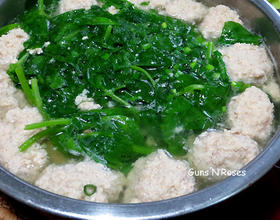 锅里添水,放入姜片,少一点点胡椒粉,烧开,把肉做成圆子状,放进锅里.