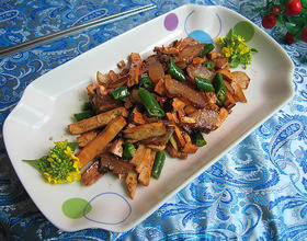 里放油烧热,倒进香干。均匀地在香干上撒上精盐将香干炒入味。