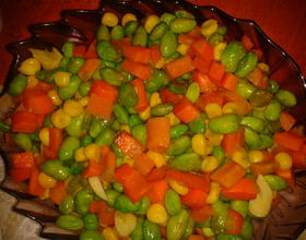 锅中放油,一次放入胡萝卜,毛豆、火腿和玉米,翻炒,吵3分钟后,放点盐,然后放点水,炒2分钟,即可