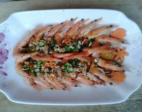 - 4. 将配料的青椒、胡萝卜、木耳切碎,蒜切成蒜蓉,入锅煸炒至金黄色,一起摆放在虾身上