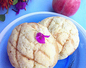 - 9. 把菠萝皮面团摊薄成片状,葡萄干面团收圆后放在菠萝皮面片上